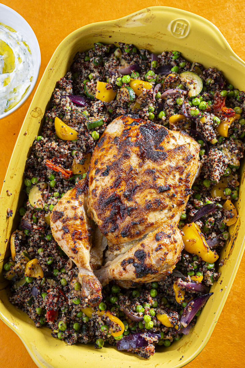 Ahjukana hapendatud sidrunitega, kinoa kevadiste köögiviljadega ning Kreeka jogurti kaste