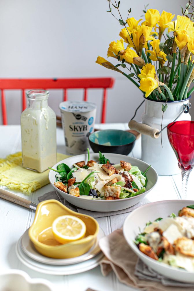 - Kui kana ja sai valmis, tõsta taldrikule salatipõhi ja ülejäänud komponendid. Vala üle maitsva kastmega ja serveeri.