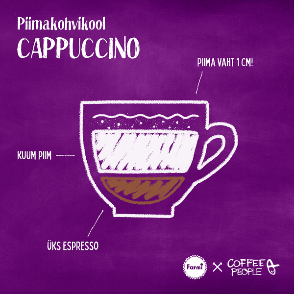 Klassikaline cappuccino koosneb 1 espressost, millele lisatakse umbes 140 g kuuma piima ja piimavahtu. Piimavahu paksus ehk mütsike peaks kohvi peal olema 1 cm. Mitte rohkem ega vähem.