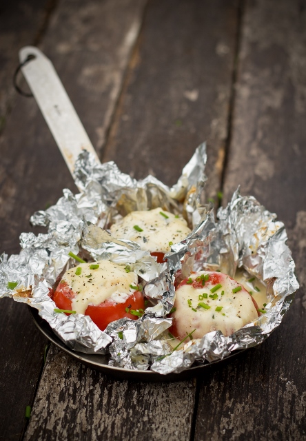 - Aseta tomatid fooliumisse ning küpseta grillile kuni juust on sulanud ning tomatid pehmed. Valmis tomatitest on mahl voolanud fooliumisse, seetõttu ära näe vaeva tomatite väljatõstmisega sealt – serveeri koos fooliumiga.