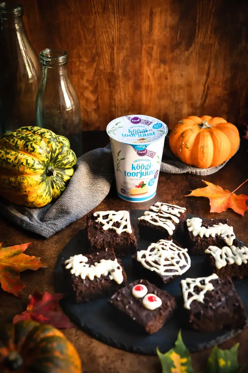 Sulata šokolaad võiga, klopi juurde suhkur ning seejärel ükshaaval munad. Lisa kõrvitsapüree ja kuivained. Vala tainas küpsetuspaberiga kaetud vormi ja puista peale hakitud šokolaadi või pähkleid (pähklid võid ka taignasse segada). Küpseta 180 kraadi juures pöördõhuga 20 minutit. Lase jahtuda, lõika ruutudeks ning kaunista toorjuustuglasuuriga – pritsi brownie’dele muumiaid, ämblikuvõrke, sajajalgseid, ning punaste marjadega saad verd täis valgunud silmade efekti.