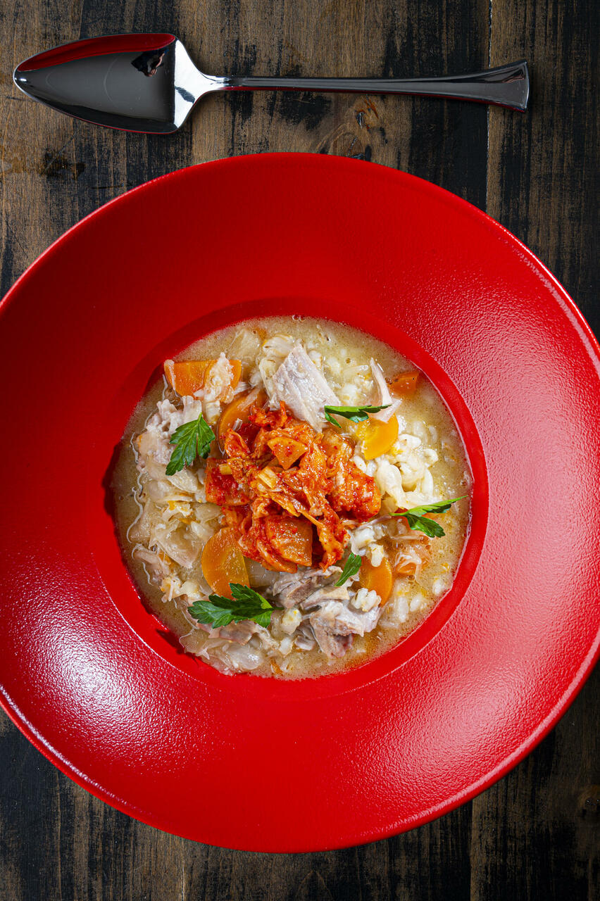 Kodune pikalt haudunud hapukapsasupp viib lihtsalt keele alla! Serveerimisel supile tõstetud kimchi lisab laheda maitsenüansi.