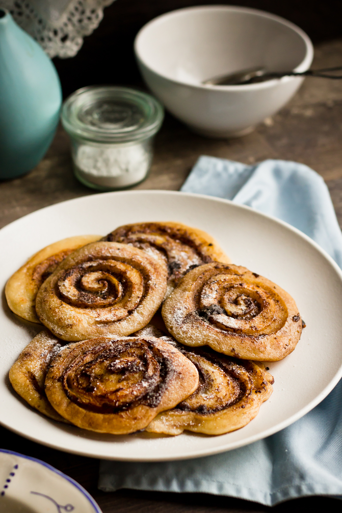 Küpseta pannil (kergelt rasvainega kaetud) pannkoogid.Küpsema pandud pannkookidele viiruta läbi peene pritskoti spiraalselt peale täidis. Kui pannukad on ühelt poolt küpsed, keera need teistpidi ning küpseta hetk ka kaneelitäidisega kaetud poolt. Valmista samamoodi ka teised pannkoogid.
