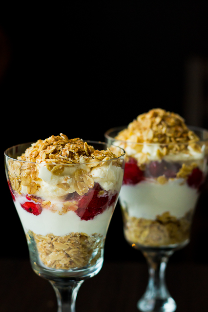 Võta 4 pokaali ning jaga pool röstitud kaerahelvestest pokaalidesse. Sega omavahel kreeka jogurt ning mesi ning jaota see pokaalidesse. Selle peale pane marjad. Vahusta koor suhkruga vahule ning jaota marjadele. Kara järelejäänud röstitud kaerahelvestega ning puista neile peale kaneeli.