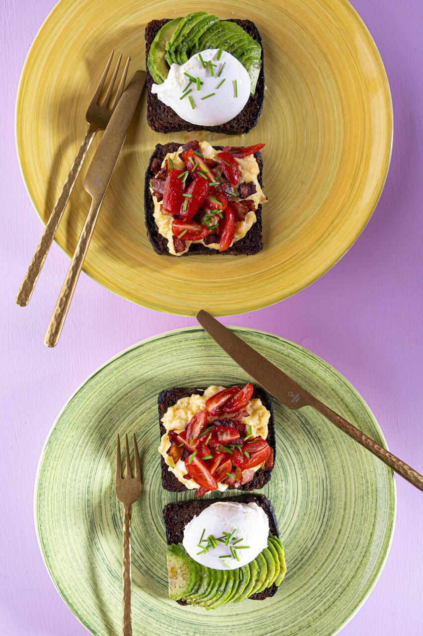 - Ühele viilule kuhja kuuma munaputru, pudista peale krõbedad peekonitükid ja tõsta neile kirsstomatid.