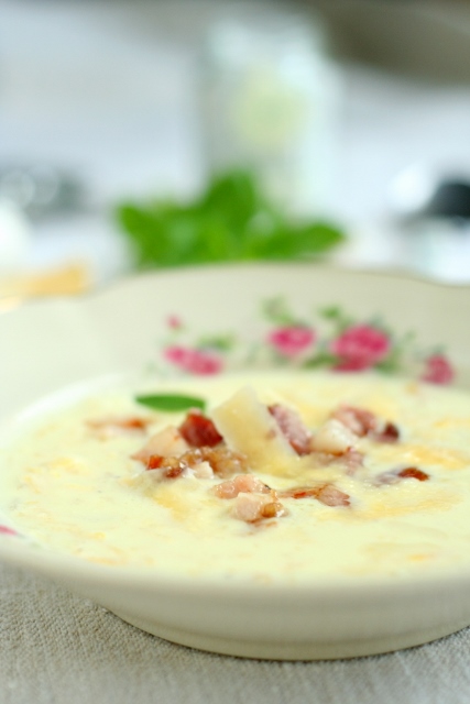 Prae paar minutit, kõrvits peab jääma kergelt krõmps. Seejärel vala juurde piim ning sulatatud juust. Keeda tasasel tulel seni, kuni juust on sulanud. Maitsesta. Viiluta peekon ning prae pannil läbi. Serveeri suppi koos praetud peekoni ning parmesaniviiludega.