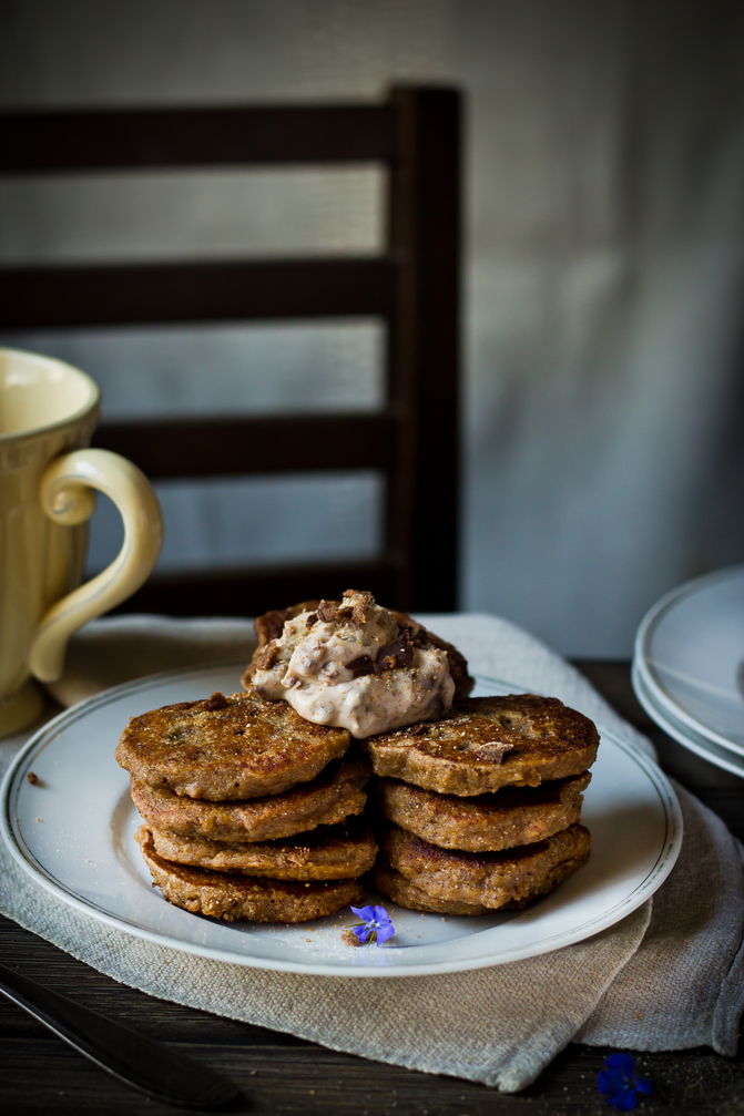 Pudenda leib peeneks ning pane kaussi, lisa segades juurde hapendatud täispiim. Püreesta saumikseriga kiirelt kogu segu läbi. Seejärel lisa ülejäänud ained ning sega kõik ühtlaseks massiks. Aseta õliga piserdatud pannile väikesed kuhjad ning küpseta madalal kuumusel mõlemalt poolt valmis. Kreemi valmistamiseks haki kommid väikesteks tükkideks ning sega toorjuustuga ühtlaseks. Serveeri pannkookidega.