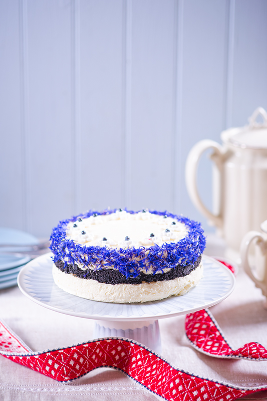 Tõmba kook noaga vormi seinte küljest lahti ja eemalda vormi küljed. Libista kook alusele, kata keskelt koogist väiksema paberist rattaga ja vajuta rukkililled koogiserva külge. Kaunista suhkrumassist või martsipanist lillede või muu meelepärasega. Säilita jahedas.
