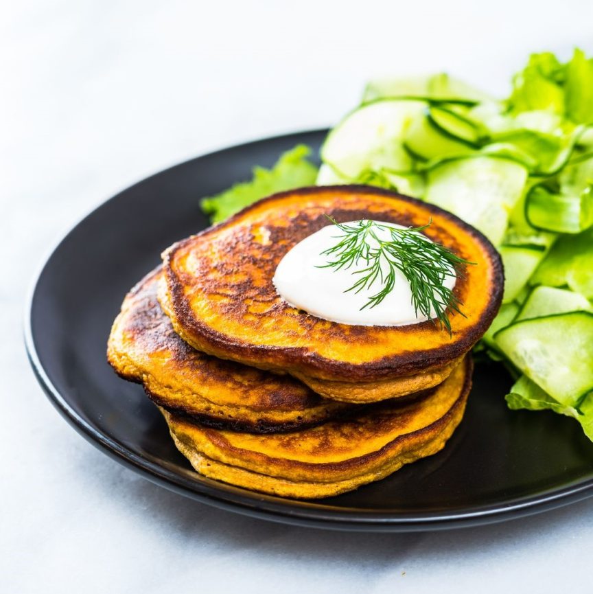 Koori ja tükelda bataat ning prae kergelt pannil 2-3 minutit kahelt küljelt. Sega muna, bataat, kaerajahu ja ürdisool (maitse järgi) ühtseks massiks, kasutades selleks blenderit, saumikserit või köögikombaini. Pane pann tulele ja kuumuta kookosrasv. Kasuta ühe koogi tarbeks ca 2-3 spl tainast ja prae keskmisel kuumusel kuni koogid on kuldpruunid. Parimaks tekstuuriks lase koogil pärast pannilt võtmist pool minutit ahjurestil jahtuda. NB! Burrito tegemisel või ülepannikoogi tegemisel kasuta ühe koogi jaoks 4-6 spl tainast.Haki kurk ja jääsalat ning sega need kokku. Serveeri pannkoogid hapukoore ja värske salatiga.