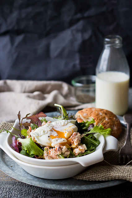 - Lisa salatilehed ja serveeri pošeeritud munaga.