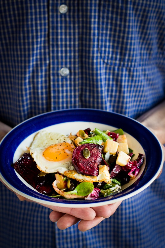 Sega salatilehed Türgi jogurtiga, jaota need taldrikutele ning lisa peedisegu (võid kergelt salatiga kokku segada). Maitsesta soola ja pipraga. Prae pannil munad valmis (soovitavalt jäta kollane vedelaks), maitsesta soola ja pipraga ning aseta salatikuhjadele.