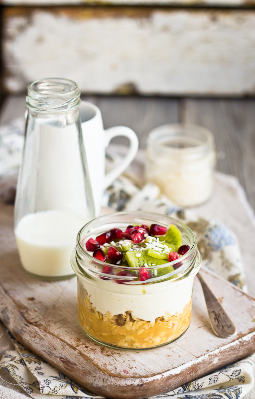 - Vahetult enne serveerimist jaga kaerahelbemass kaussidesse/purkidesse, jaota peale skyr´i segu ning kaunista maius kookoshelveste ja meelepäraste puuviljadega.