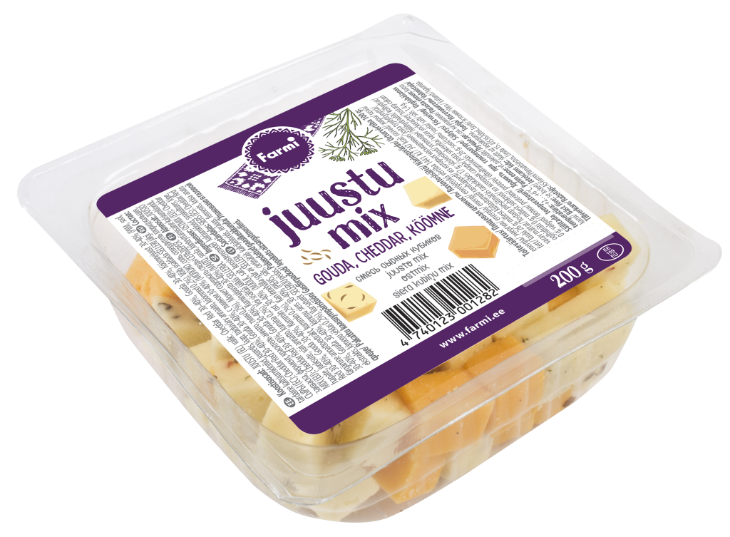 JUUST (PIIM, sool, tardaine kaltsiumkloriid, juuretis, laap, toiduvärv annaato, köömned). Võib sisaldada SELLERI jälgi.