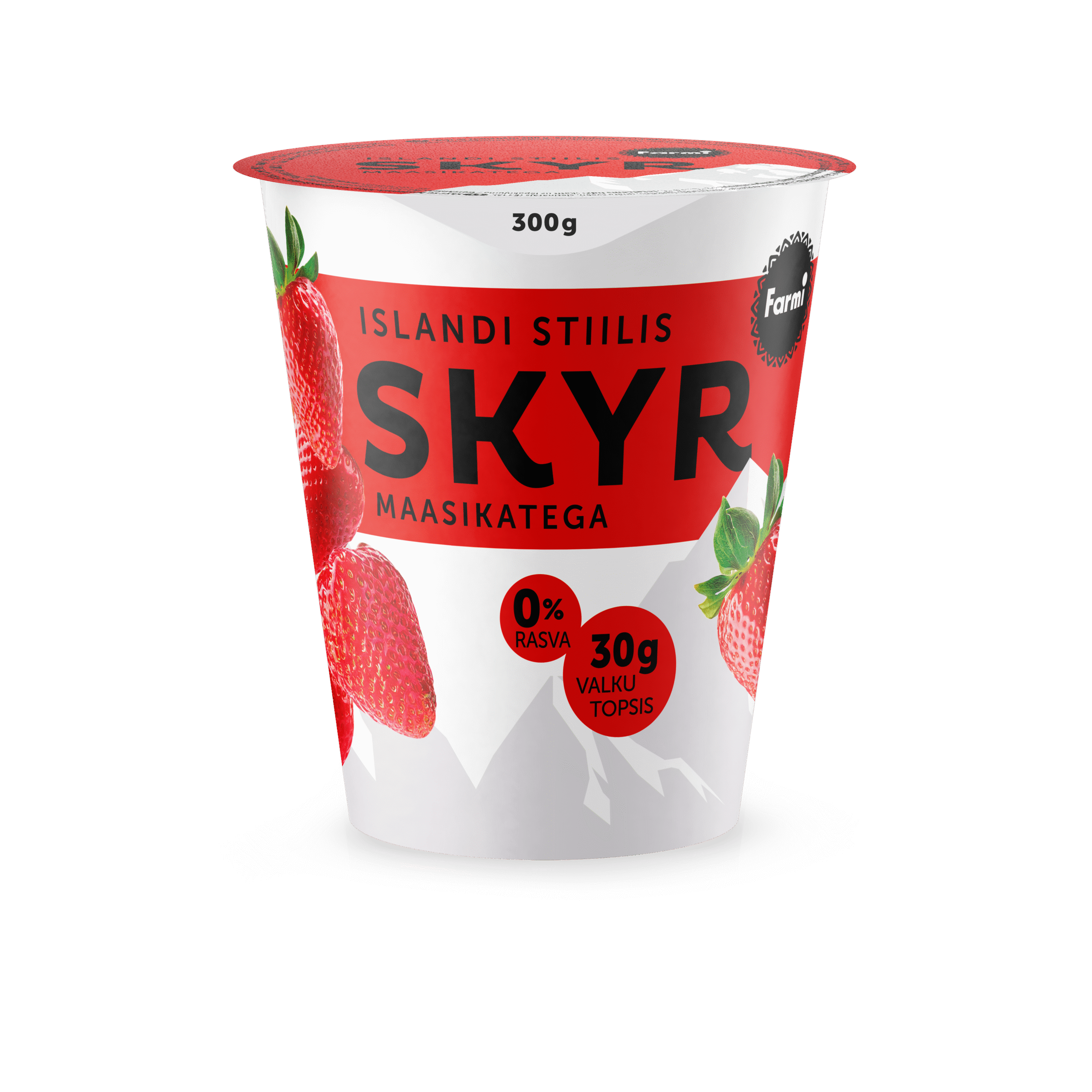 SKYR 88% (rasvatu PIIM, juuretis), maasikamahl mahlakontsentraadist 4,7%, maasikad 3,9%, suhkur, modifitseeritud tärklis, lõhna- ja maitseaine, porgandikontsentraat, paksendaja (pektiin, guarkummi), tardaine (E333).